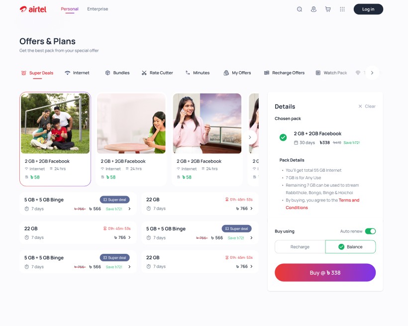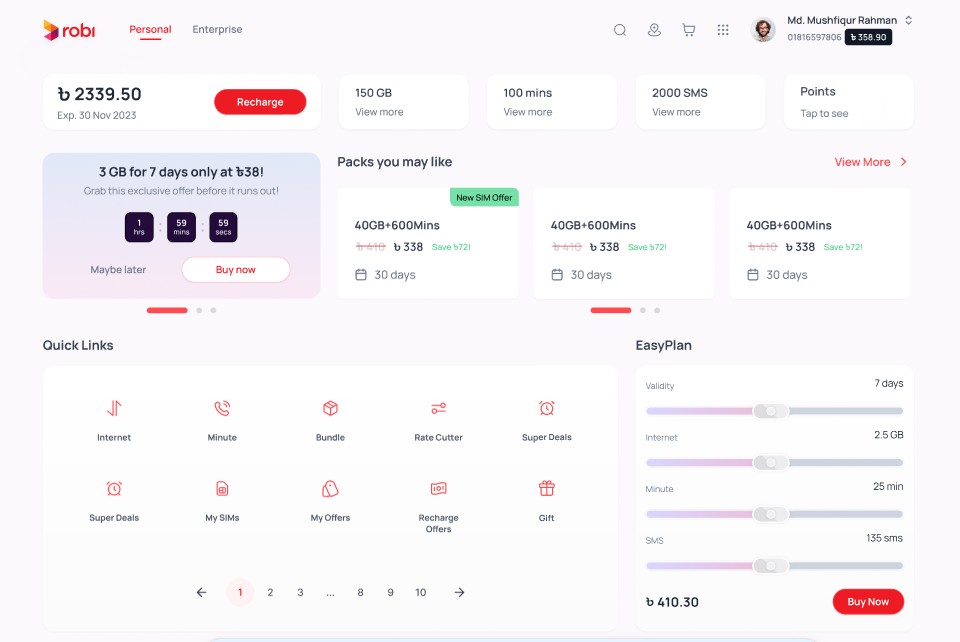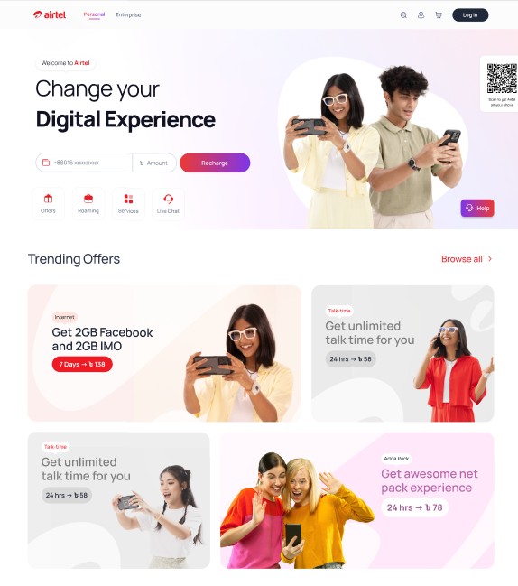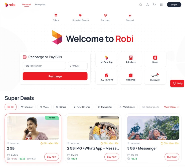 The goal is to revamp the Robi and Airtel BD Corporate Websites, providing customers in and out of Bangladesh with a comprehensive array of services by providing a seamless, engaging, and accessible experience for users across all internet-enabled devices. The new websites features a high-quality UX/UI design and will serve as the first digital touchpoint for non-Robi customers, allowing them to explore both brands and seamlessly convert to customers through SIM services on the website. The websites also drives revenue by offering a comprehensive range of telco products, including pack purchases, recharges, and other services.